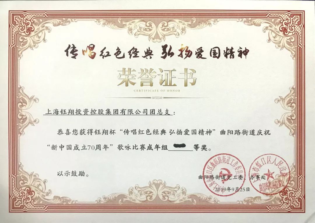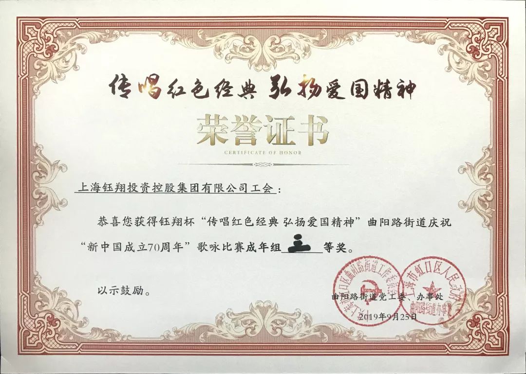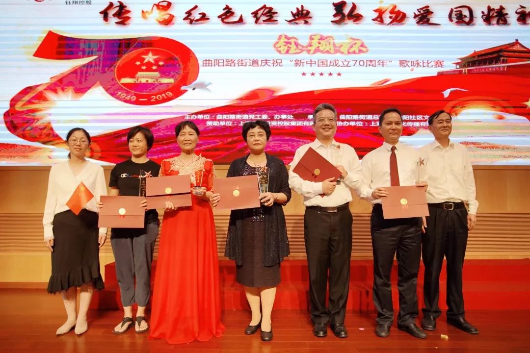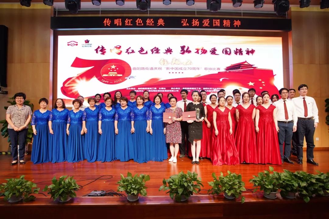 9月25日,傳唱紅色經(jīng)典、弘揚(yáng)愛(ài)國(guó)精神——“鈺翔杯”曲陽(yáng)路街道慶祝“新中國(guó)成立70周年”歌詠比賽決賽圓滿(mǎn)落下帷幕。集團(tuán)團(tuán)總支和工會(huì)兩支隊(duì)伍進(jìn)入決賽,決賽中集團(tuán)團(tuán)總支演唱的《我愛(ài)你中國(guó)》榮獲一等獎(jiǎng),集團(tuán)工會(huì)演唱的《中國(guó)人》榮獲三等獎(jiǎng),取得了優(yōu)異的成績(jī)。