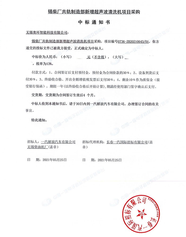 日前,我司中標一汽解放錫柴廠共軌制造部新增超聲波清洗機項目。我司在國內動力總成系統尤其是燃油噴射系統清洗的占有率和覆蓋面持續擴大。