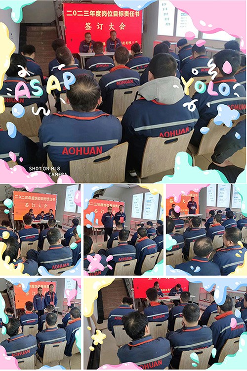 2023年1月31日下午,我司隆重召開2023年度崗位目標責任書簽訂大會。會上,總經理楊陽代表公司與技術、生產、市場等部門負責人及安全、質量、倉庫等重點崗位員工簽訂了2023年度崗位目標責任書。相關負責人和重點崗位員工均圍繞目標任務作表態發言,進一步明確奮斗目標,制定工作措施。
